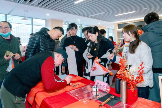 “拓福呈祥”攤位前,參與者使用傳統(tǒng)墨油與雕版拓印駿馬揚(yáng)蹄等圖案,方寸之間盡顯匠心巧思;“福澤文禮”攤位人氣高漲,書法家揮毫潑墨間不僅送上春聯(lián)福字,更悉心講解平仄對(duì)仗格律、張貼禮儀與楹聯(lián)知識(shí)。