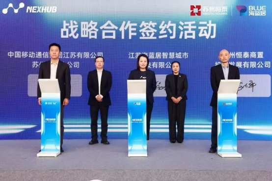 活動現場,恒泰商置、江蘇海藍居與中國移動達成深度戰略合作簽約。三方將以NEXHUB為核心載體,在數字基礎設施建設、AI創新服務落地、創業生態完善等方面深度協作,共同打造蘇州聯合辦公領域的標桿典范。