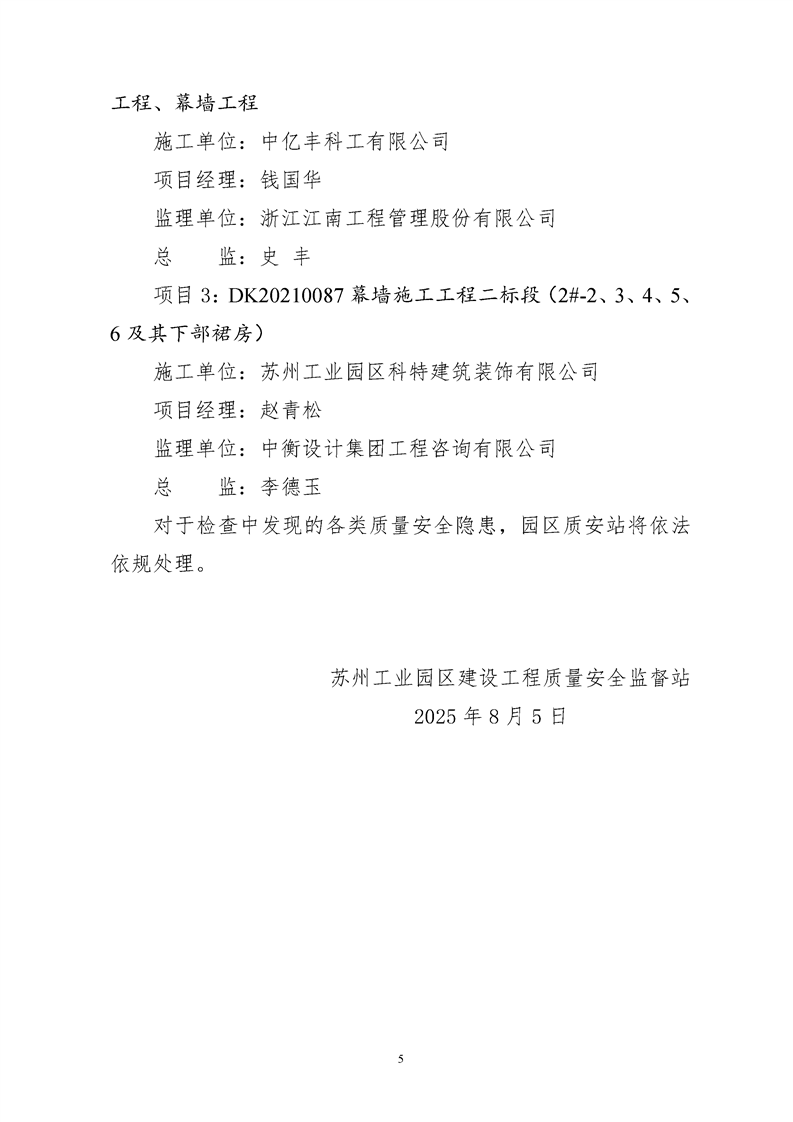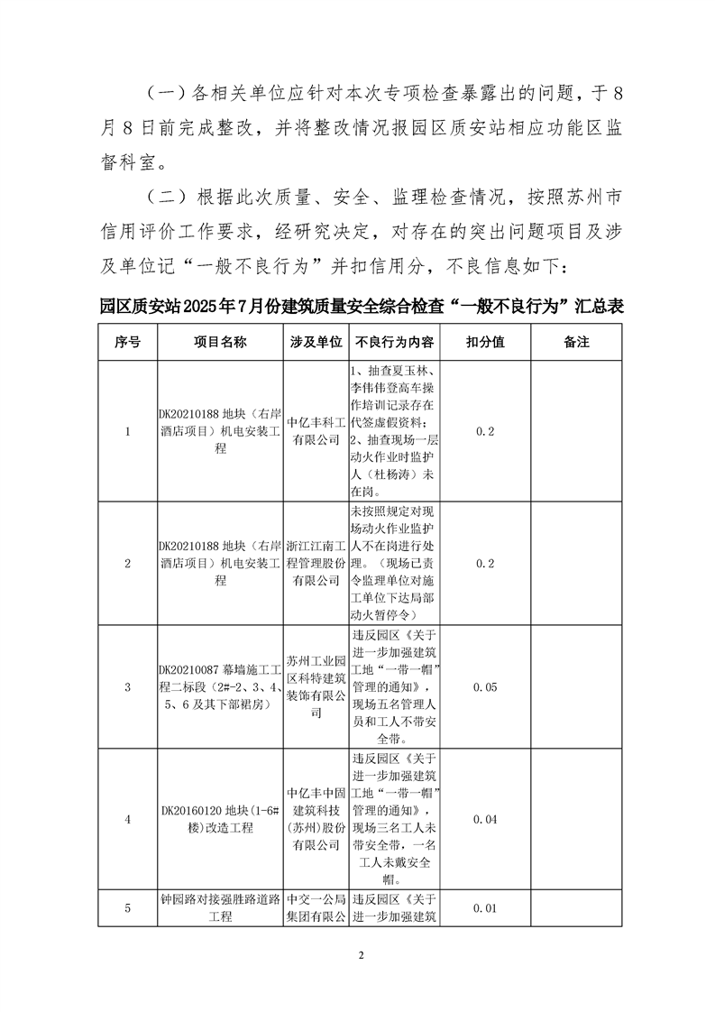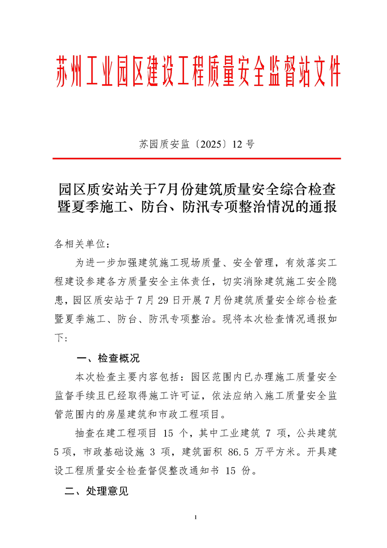 園區質安站關于7月份建筑質量安全綜合檢查暨夏季施工、防臺、防汛專項整治情況的通報