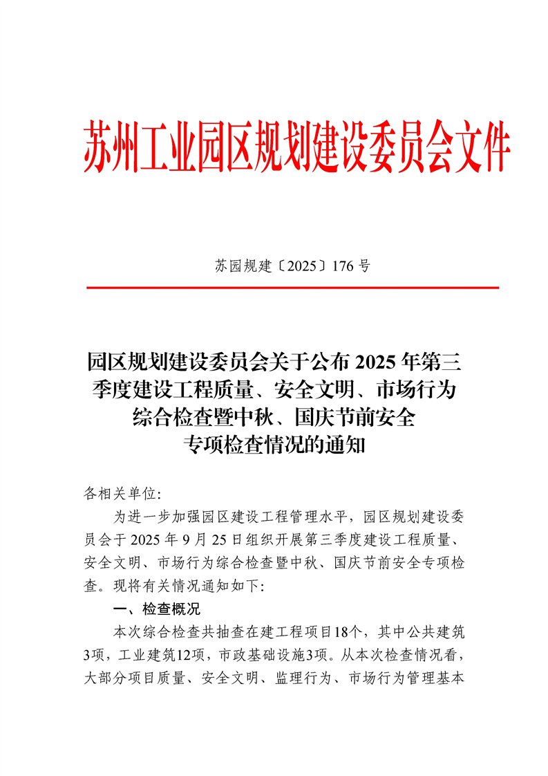 園區(qū)規(guī)劃建設(shè)委員會(huì)關(guān)于公布2025年三季度建設(shè)工程質(zhì)量、安全文明、市場(chǎng)行為綜合檢查暨中秋、國(guó)慶節(jié)前安全專(zhuān)項(xiàng)檢查情況的通知