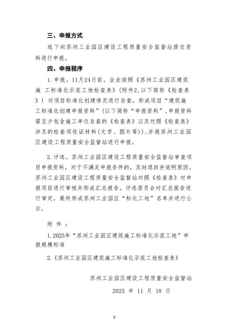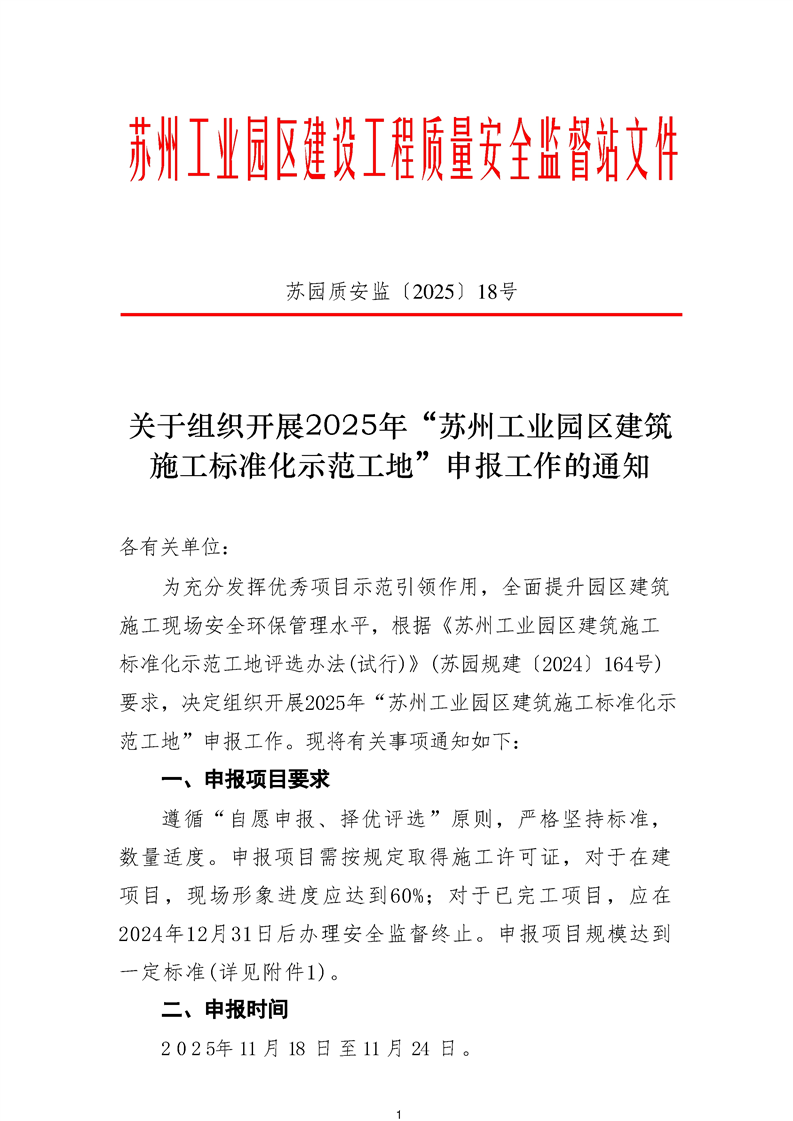 關(guān)于組織開(kāi)展2025年“蘇州工業(yè)園區(qū)建筑施工標(biāo)準(zhǔn)化示范工地”申報(bào)工作的通知