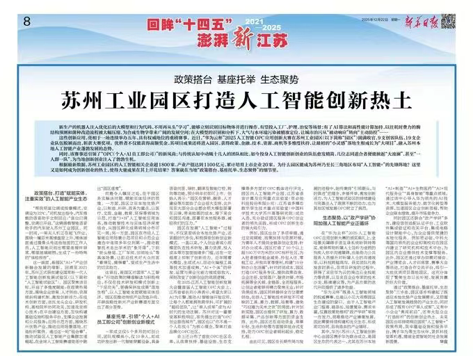 12月22日,《新華日報》聚焦蘇州工業園區,“政策搭臺 基座托舉 生態聚勢”,打造人工智能創新熱土。