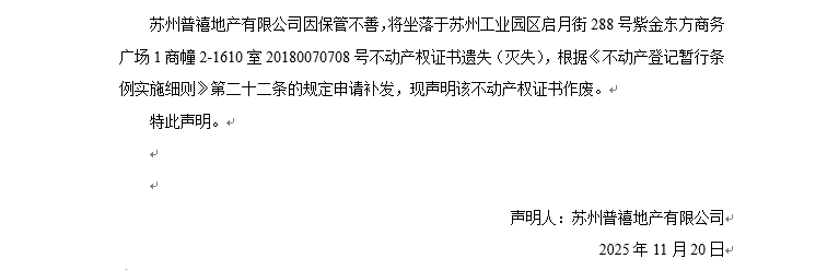 關于蘇州工業園區啟月街288號紫金東方商務廣場1商幢2-1610室20180070708號不動產權證書遺失聲明