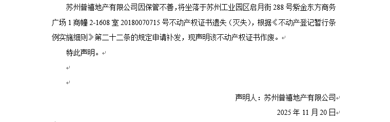 關于蘇州工業園區啟月街288號紫金東方商務廣場1商幢2-1608室20180070715號不動產權證書遺失聲明