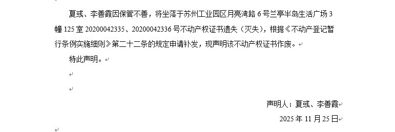 關于蘇州工業園區月亮灣路6號蘭亭半島生活廣場3幢125室20200042335、20200042336號不動產權證書遺失聲明