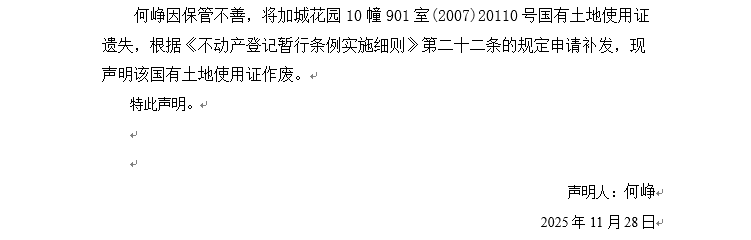 關于加城花園10幢901室(2007)20110號國有土地使用證遺失聲明