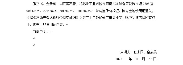 蘇州工業園區榭雨街398號香頌花園4幢2703室00442875、01742393、201262749、201262750號房屋所有權證、國有土地使用證遺失聲明