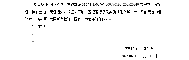 關于獨墅苑516幢1503室 00077019、200526340號房屋所有權證、國有土地使用證遺失聲明