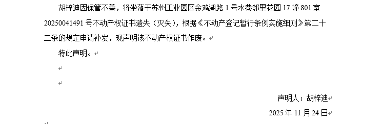關于蘇州工業園區金雞湖路1號水巷鄰里花園17幢801室20250041491號不動產權證書遺失聲明