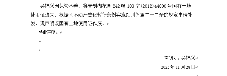 關于青劍湖花園242幢103室(2012)44800號國有土地使用證遺失聲明