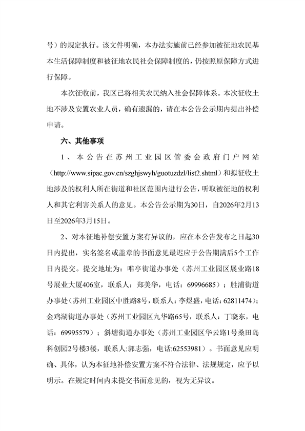 蘇州工業(yè)園區(qū)管理委員會(huì)征地補(bǔ)償安置方案公告(蘇工園征補(bǔ)安置〔2026〕001號)