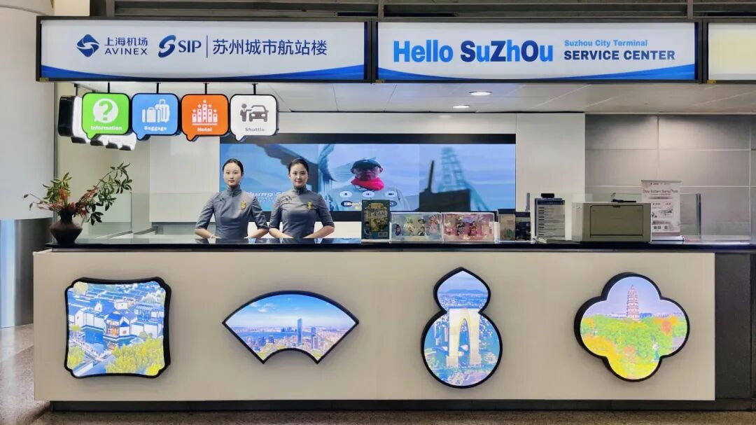 蘇州市が上海國際航空ハブと接続する重要なプラットフォームとして、上??崭厶K州サービスセンターは上海浦東國際空港のT1とT2ターミナルに位置し、旅客に問い合わせ、蘇州観光ルート紹介、蘇州への交通案內、空港送迎、荷物預かりなど様々なサービスを提供する。