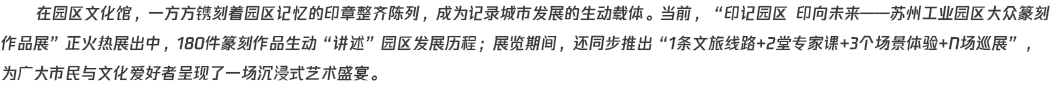 「印記園區(qū)印向未來」蘇州工業(yè)園區(qū)大眾篆刻作品展持續(xù)熱展中。傳統(tǒng)印面·對話當(dāng)代地標(biāo),歷史印記·融合未來表達(dá),多維創(chuàng)作·科技賦能,十余種創(chuàng)新治印... [詳細(xì)]