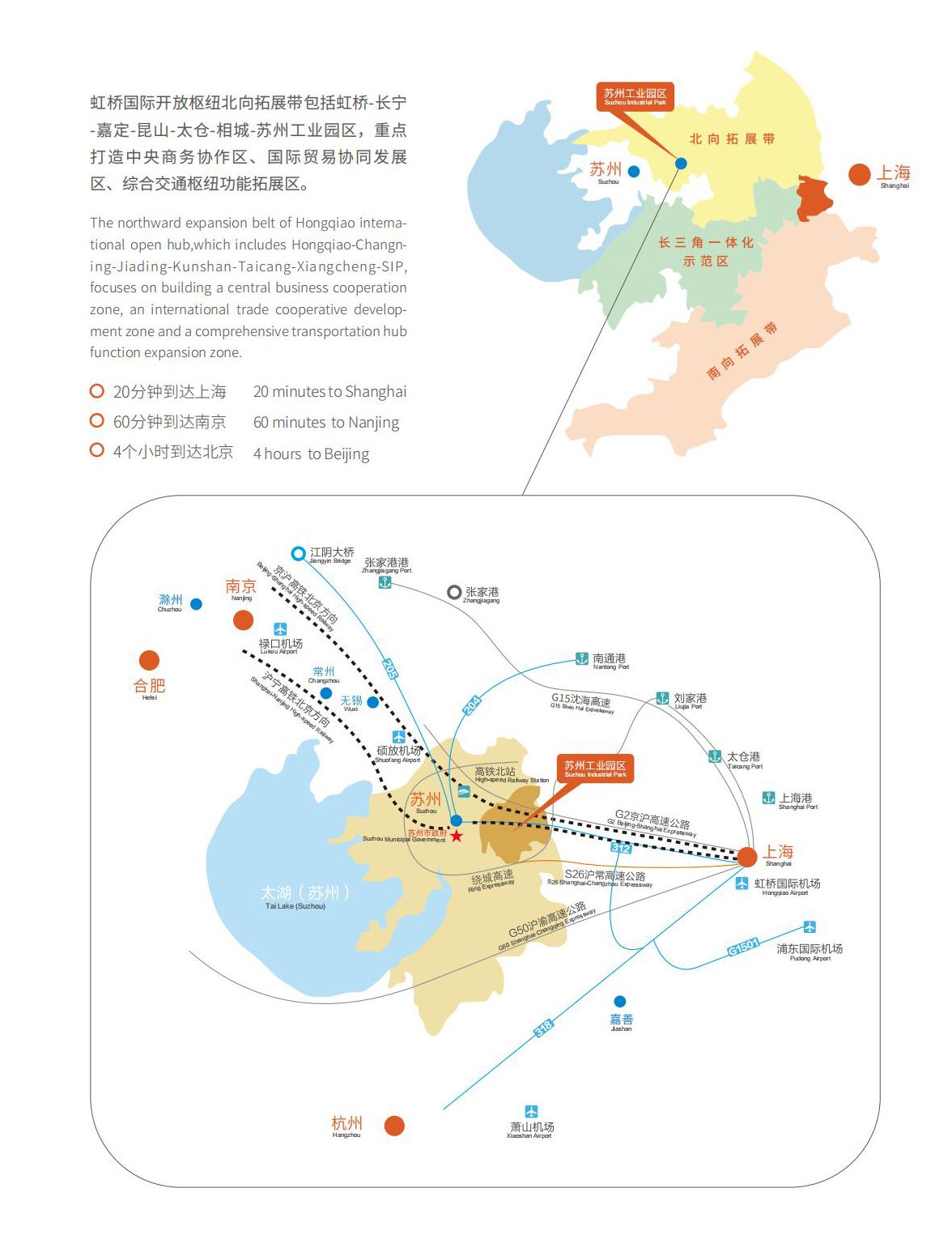 蘇州工業(yè)園區(qū)是蘇州面向未來的城市新中心,以發(fā)達的高速公路、鐵路、水路及航空網(wǎng)與世界各主要城市相連;軌道交通20分鐘到達上海、60分鐘到達南京、4個小時到達北京,是長三角地區(qū)重要的總部經(jīng)濟和商務文化活動中心,是虹橋國際開放樞紐北向拓展帶的重要一環(huán)。