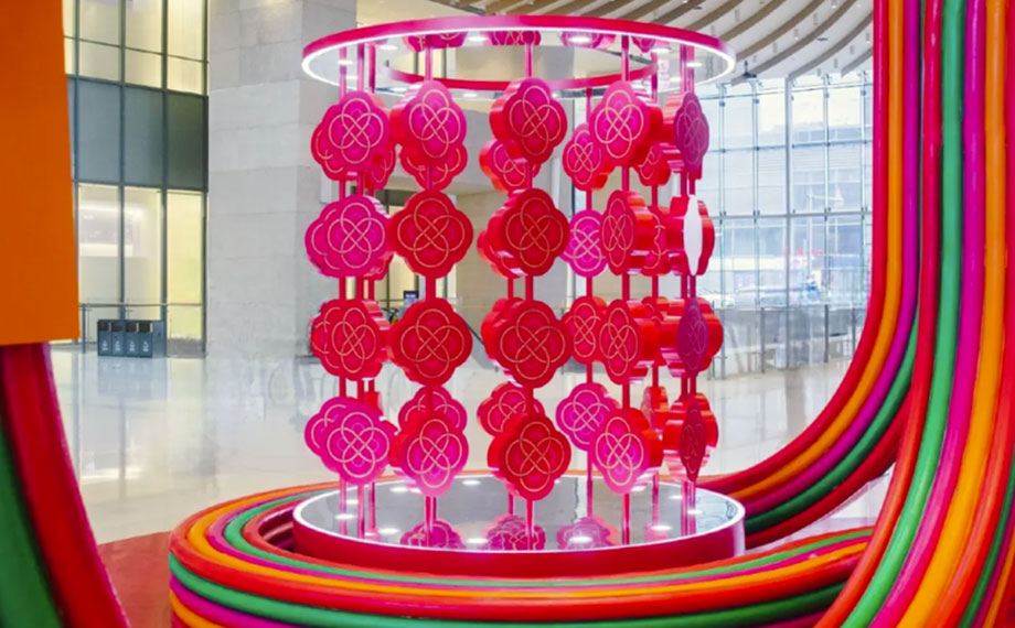 在蘇州中心商場,被古人賦予美好寓意的中國結以靈蛇造型在一樓中庭驚艷亮相,帶來“靈蛇繞福,凝心啟運”的新年祝福,靈蛇的體態蜿蜒流暢,與中國結的線條完美融合,形成了獨特的視覺美感。