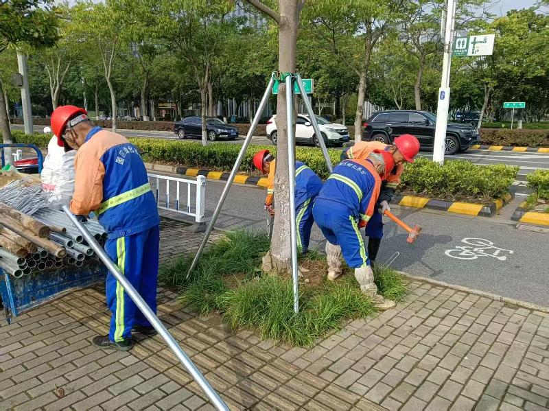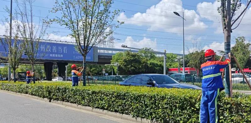 全面排查并完成高大易倒伏喬木的加固支撐和安全處置。對2500余棵樹冠較大喬木進行梳枝修剪,整理并加固帶有支撐的喬木6500余棵,預備500副鋼管支撐,組建倒伏苗木處置隊伍。加固或拆除高空構筑物、工地圍擋等設施,消除傾倒隱患,排查公共停車場等地下空間的安全運行情況。開展全區(qū)路燈、景觀燈、廣告牌及交通設施巡查加固,嚴防高空墜物風險。在公園等臨水區(qū)域設置警戒線,同步加強保安巡查頻次。