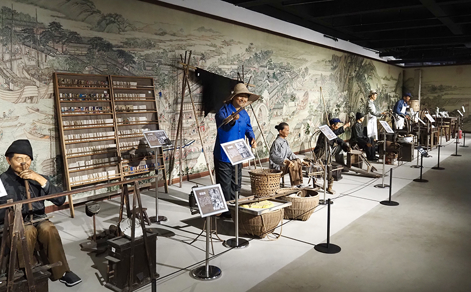 此外,館內特別設置的江南水鄉場景,通過漁船置景、農灶木具、繡布巾等物件,具象化呈現“男耕女織”的傳統生活與河塘風光。消失的市井行當通過蠟像與老物件得以“復活”,“雞毛換糖”的吆喝、補碗匠的巧技、餛飩擔的煙火、小書攤的墨香,這些逐漸淡出視野的行當,成為幾代人珍藏的記憶符號。