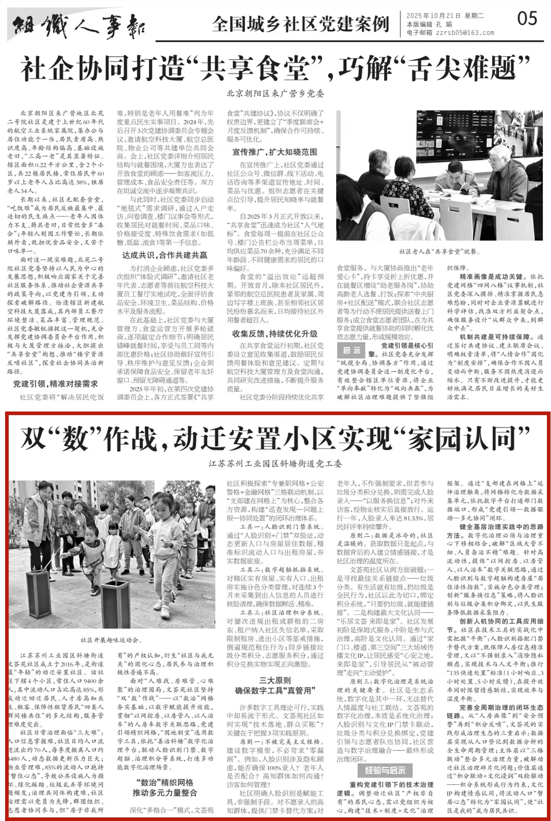 以“智”治思維破解動遷安置小區治理難點堵點,推動數字技術與基層治理深度融合……近日,《組織人事報》刊發《雙“數”作戰,動遷安置小區實現“家園認同”》一文深度報道蘇州工業園區斜塘街道文薈苑社區破解基層治理的創新路徑及實踐成效。