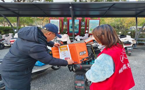 趣味互動(dòng)結(jié)束后,小哥們化身社區(qū)治理的“移動(dòng)宣傳員”,開啟了宣傳圖文張貼任務(wù)。社區(qū)為小哥們準(zhǔn)備了涵蓋反詐知識(shí)、消防安全等內(nèi)容的宣傳海報(bào)和折頁,資料設(shè)計(jì)貼心細(xì)致,既有醒目易懂的漫畫圖解,又清晰印著社區(qū)服務(wù)聯(lián)系方式。小哥們熟練地將宣傳資料張貼在自己的電動(dòng)車上,借助日常配送“走街串巷、全域覆蓋”的“移動(dòng)探頭”天然優(yōu)勢(shì),讓實(shí)用知識(shí)精準(zhǔn)觸達(dá)千家萬戶。外賣員李師傅一邊仔細(xì)張貼海報(bào),一邊由衷感慨:“平時(shí)送餐路過總能留意到不少角落,現(xiàn)在能為社區(qū)宣傳出份力,真切感覺自己也是社區(qū)的一份子了!”