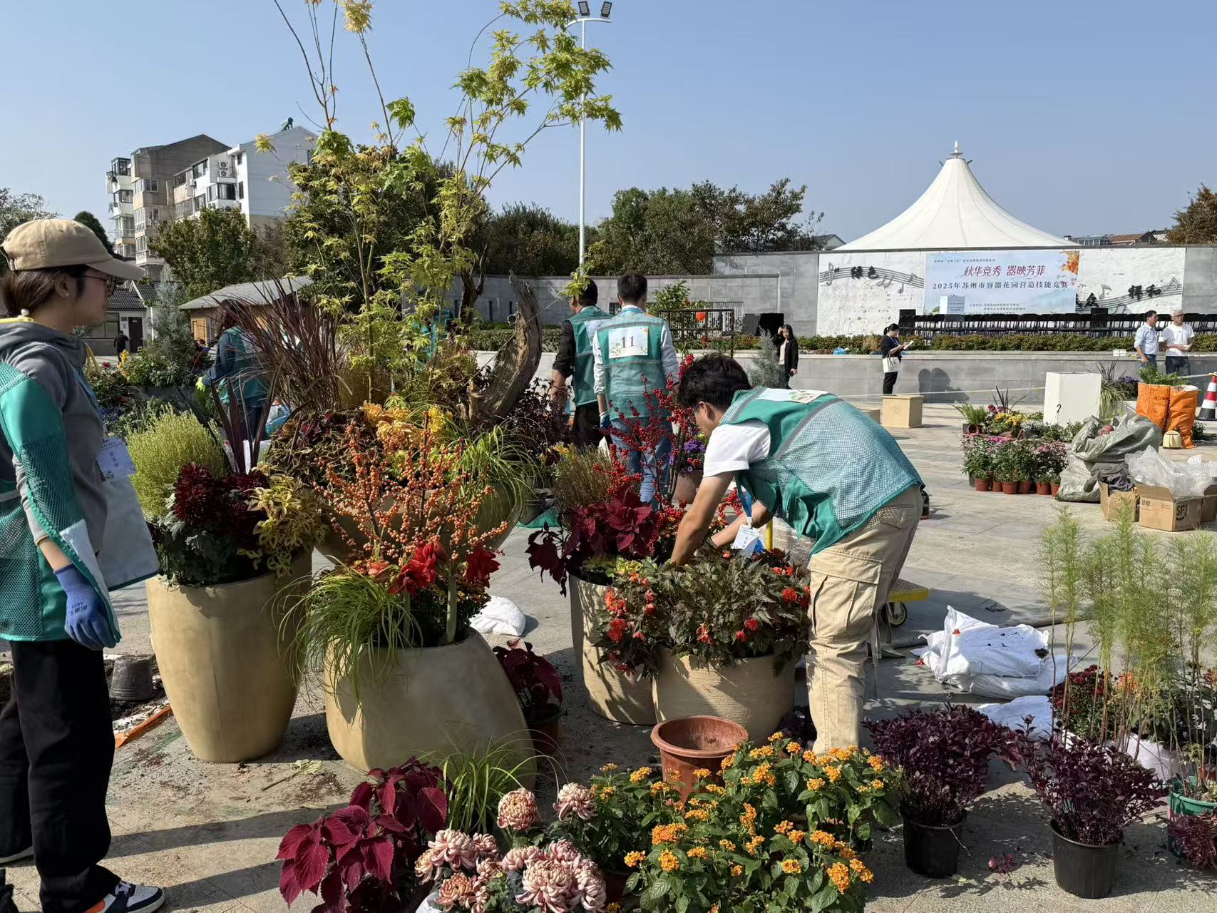 11月14日,蘇州大市范圍26支優秀的綠化行業代表隊在蘇州市桂花公園“秋華競秀,器映芳菲”——容器花園營造技能競賽現場展開激烈角逐。園區綠化精心選派的三支行業代表隊以穩定發揮充分展示了蘇州工業園區綠化管養隊伍扎實的專業素養,其中園區“湖濱園林隊”憑借精妙的空間創意、科學的植物配置與高效的實操能力脫穎而出,以新時代工匠精神斬獲賽事第一。