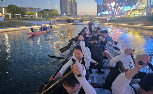 活動的精彩并不僅限于午間。夜幕降臨,由20余名職工踴躍報名組成的“葑焱龍騎隊”準時集合,將激情從陸地延伸至水上。這支零基礎的隊伍從握槳姿勢學起,在每周四晚的例行訓練中,直面體能、節奏與技術的挑戰,反復打磨起航、沖刺與300米直道節奏的每一個細節。通過參加園區總工會組織的蘇州工業園區職工運動會青年龍舟邀請賽和多次蘇州市大眾體育聯賽龍舟系列賽,龍舟隊在實戰中得到了錘煉,在一次次的并肩作戰中,隊員們積累了寶貴的比賽經驗,彼此的配合也越發默契,團隊的凝聚力在汗水與吶喊中持續升華。