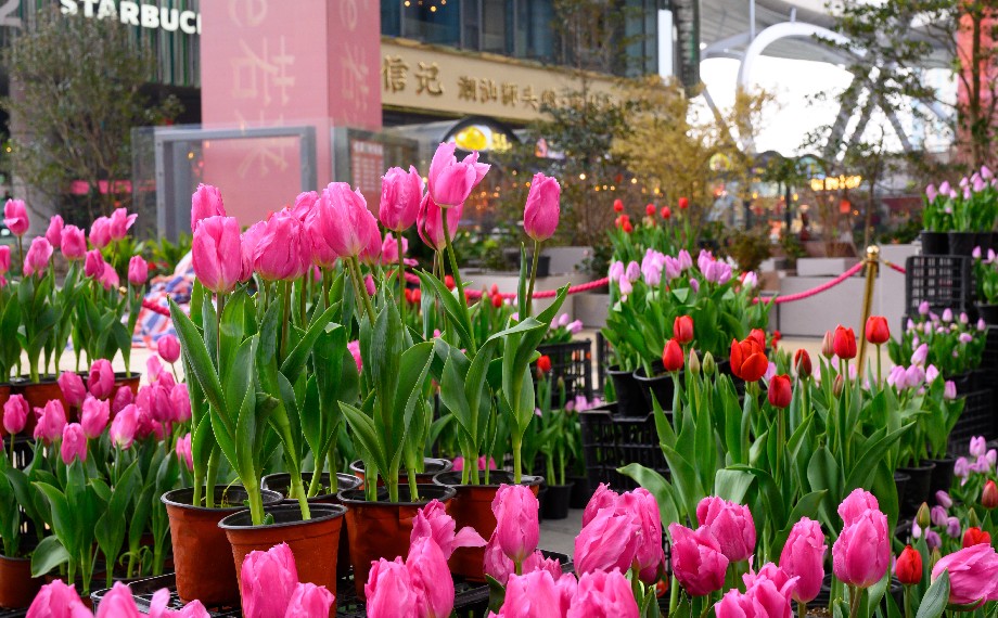 活動現場,嫩白的“凌波仙子”、鵝黃的重瓣水仙、甜美的山茶、典雅的蝴蝶蘭,以及獨具姿態的各色郁金香等,匯聚天幕東街和西街的中心廣場,構成一組組花團錦簇的特色景觀,引得市民游客紛紛駐足。