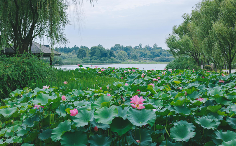 蓮池湖公園地處半島核心,與重元寺隔路相望,總占地面積約79公頃。澄澈湖面與蔥郁綠植相映成畫,黃、紫、橙、紅、白五色園林植物錯落分布,四季景致各有韻味。春日木繡球瑩白滿枝,引得市民游客紛紛駐足打卡;盛夏荷葉田田,深秋蘆葦搖曳,園內(nèi)古橋木廊臨水而建,漫步其間,禪意悠然,是都市人尋覓安寧的絕佳去處。