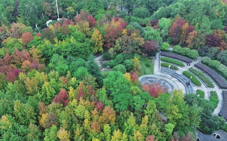 在昨天的綿綿秋雨中,楊樹、欒樹、水杉等各色樹木將園區方洲公園“染”成一幅色彩斑斕的油畫。