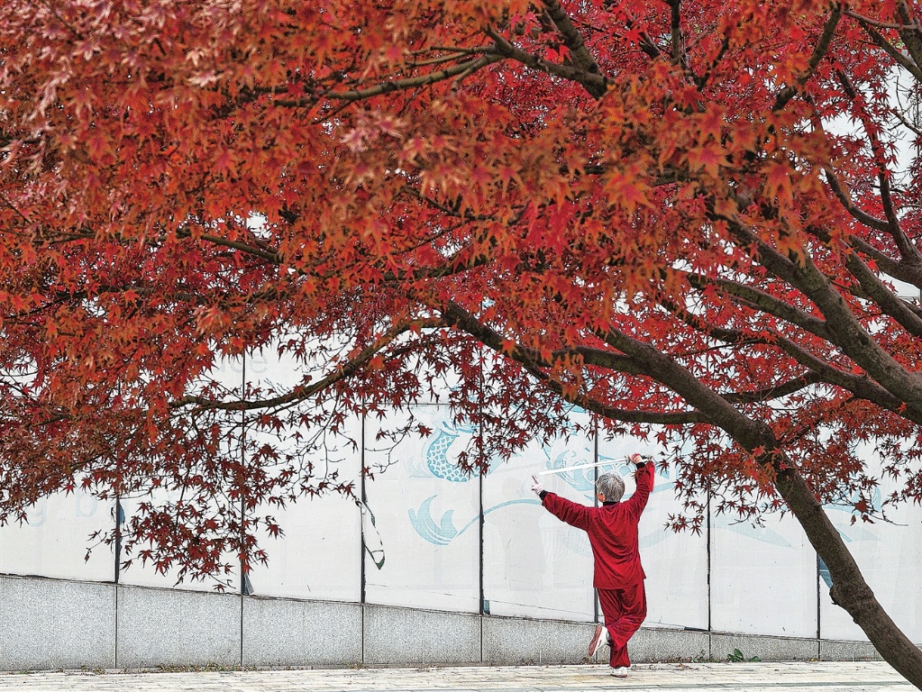 昨天,一位市民在園區獨墅湖畔的楓樹下鍛煉,人景交融,令人陶醉。