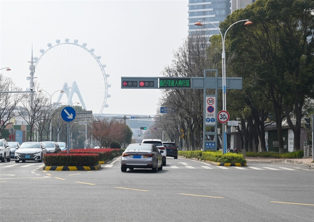 “道路資源是有限的,不能總是靠拓寬馬路來解決問題,必須在精細化管理上找出路。”蘇州工業園區交管大隊秩序中隊中隊長何清介紹。面對困局,蘇州交警的解法不是拓寬馬路,而是實施精準“微創手術”:利用對角線左轉放行的十幾秒間隙,在路口開辟“直行待行區”。經多輪實地調研與仿真模擬,待行區精確設定為可容納3至4輛標準轎車,并配套智能提示系統——南北左轉時提示直行進入,東西直行時提示左轉待行。信號周期中原本閑置的“碎片化”時空被巧妙拼接,實現了空間利用率的最大化。