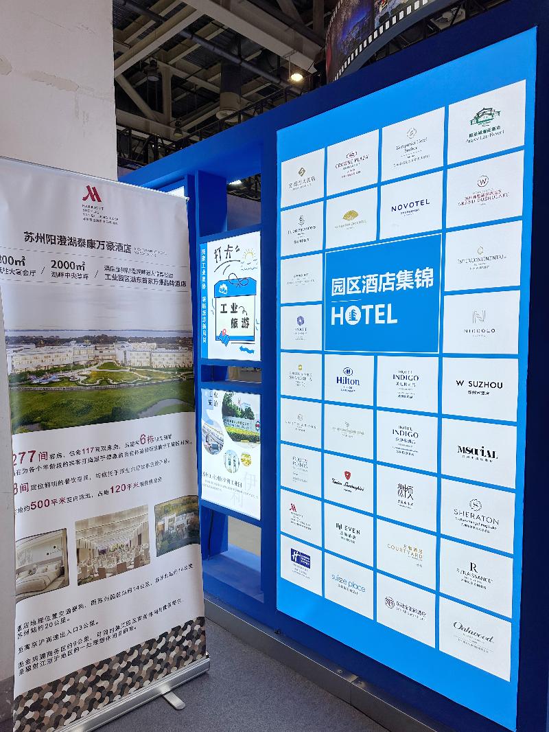 展廳中央更是藏著不少驚喜。“惠游園區”智慧文旅平臺的成果讓人眼前一亮,今年上半年,平臺總交易額破億元,注冊用戶達163.2萬人,成為園區商旅文體展集成服務主門戶;工業旅游區集中展示四大特色工業旅游點及“新趣研學”主題研學線路,詮釋“旅游+工業”創新實踐;近40家品牌酒店組成的LOGO集錦墻,彰顯園區作為兼具國際范、煙火氣與人文韻的文旅目的地的吸引力,亦是“宜居宜業宜游”創新之城的生動注腳。