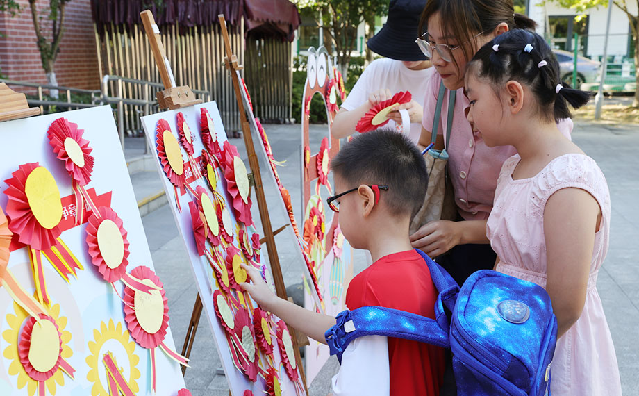 貼上小紅星,一年級新生的臉上滿是喜悅。他們與爸爸媽媽一起走進校園,在打卡裝置前拍照留影,發出“我是星灣娃”“我上一年級啦!我會更努力”等“宣告”。一年級新生陳千阡對星灣的學習生活充滿好奇也飽含期待,她興奮地表示:“我的目標是成為一名班長,我會加油努力!”