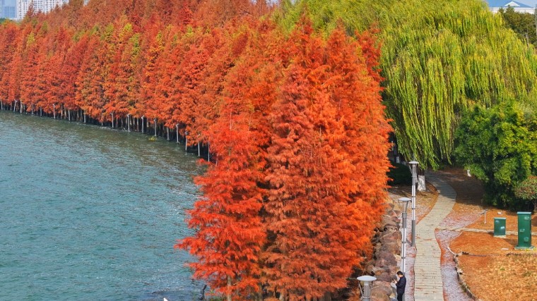 沿斜塘河漫步,成片水杉林沿河岸綿延,形成一道溫暖的濱水風(fēng)景線。午后陽(yáng)光穿過赤金色枝葉,在步道上投下斑駁光影,讓河岸變成了一幅絕美的油畫。