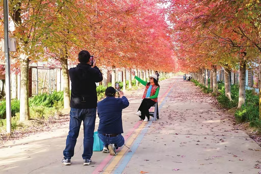 昨天,園區(qū)陽(yáng)澄湖半島浦田生態(tài)農(nóng)業(yè)園紅楓大道丹楓如火,吸引了眾多游客前來賞楓。
